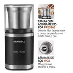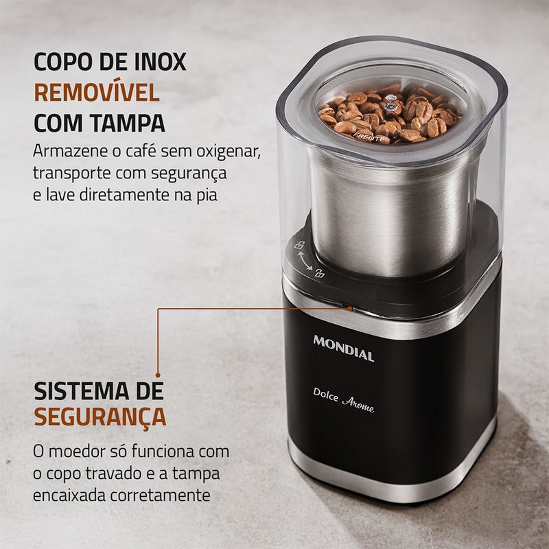 Prático e funcional, o moedor da Mondial possui tampa com trava de segurança e acionamento por pressão, permitindo controlar facilmente o tipo de moagem, da mais fina à mais grossa, para adequar o pó aos diferentes métodos de extração, como espresso ou coado.