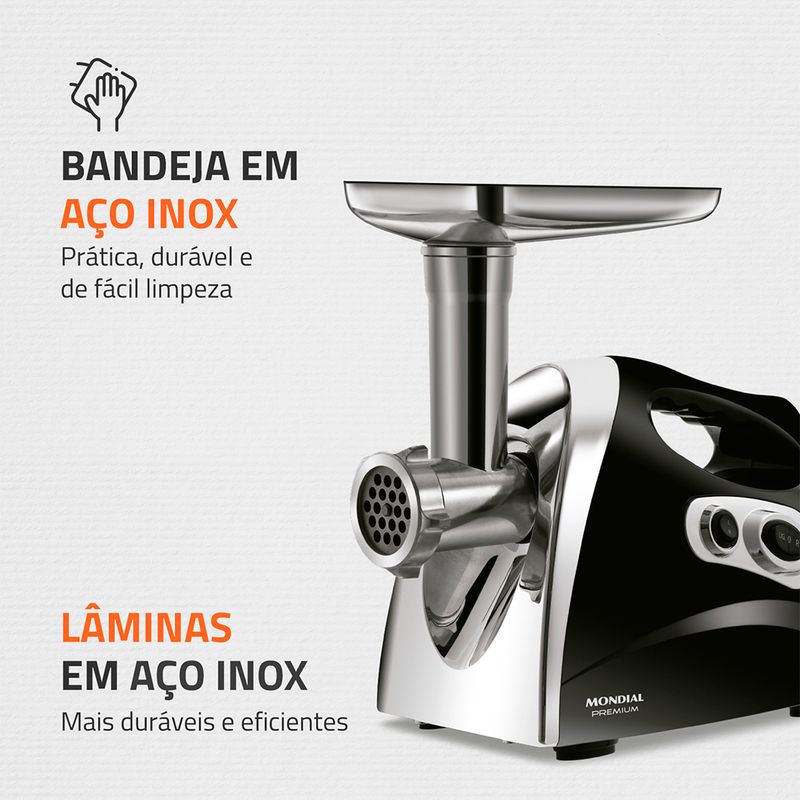 KIT ACESSÓRIOS: Acompanha 1 pilão, 3 discos moedores, 1 modelador de bolinhos, 1 cone para modelar linguiça e 1 bandeja em inox para carne.