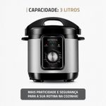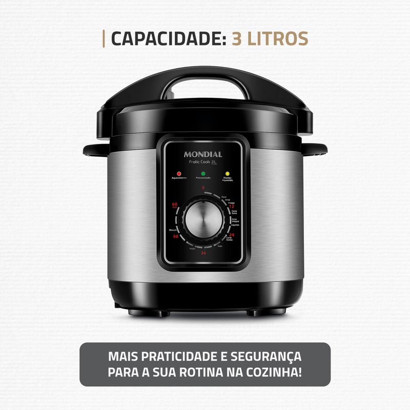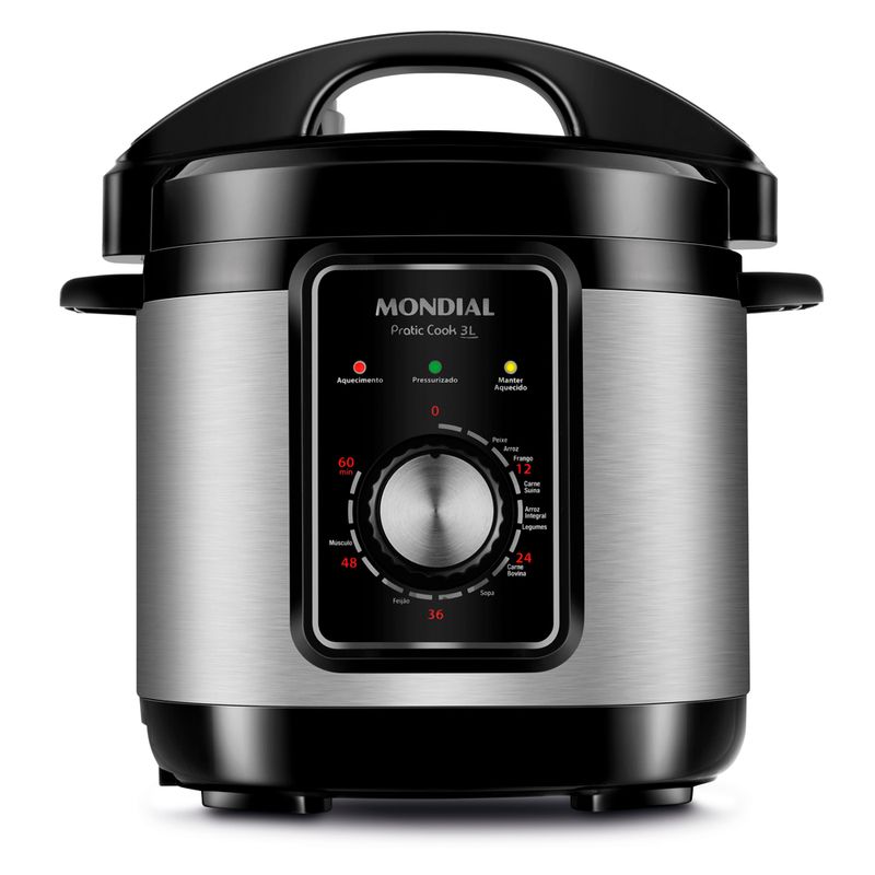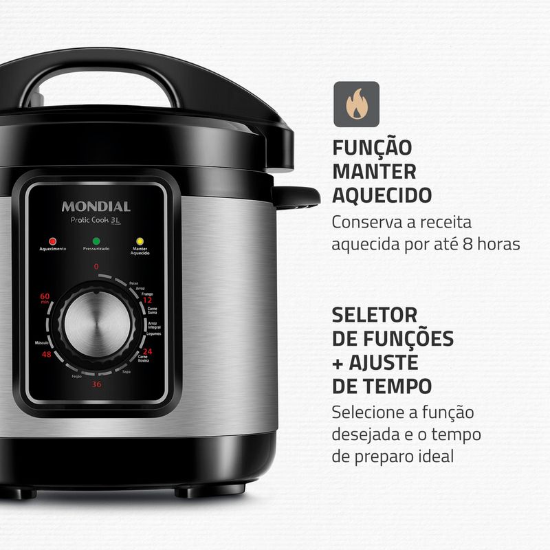 A Panela de Pressão Elétrica Pratic Cook 3L Mondial vai te surpreender com mais praticidade e sabor nas receitas! Com capacidade de 3 litros, permite o preparo de carnes, feijão, legumes, pudim e muito mais. Possui mecanismos de segurança, cuba antiaderente removível, botão para programação de tempo e função Manter Aquecido, para você servir os alimentos quentinhos por mais tempo. Saiba mais sobre a PE-47-3L-I da Mondial: