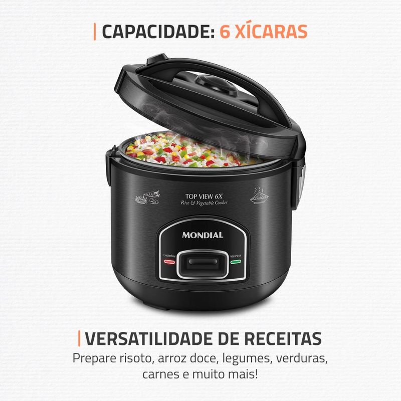 A Panela Elétrica Top View 6X Mondial prepara até 6 xícaras com praticidade. A tampa com visor transparente permite ver o cozimento em tempo real e ainda valoriza o design com um acabamento moderno. Versátil, faz diferentes tipos de arroz e ainda permite criar receitas com legumes, verduras e carnes. A cuba antiaderente removível facilita a limpeza, enquanto a função aquecer mantém o arroz quentinho por horas. Com 1 ano de garantia Mondial, é uma escolha segura e eficiente para a rotina na cozinha. Saiba mais sobre a PE-30-6X da Mondial: