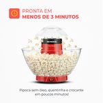 POTÊNCIA: 1.200W O milho estoura rapidamente e a pipoca fica pronta em menos de 3 minutos.