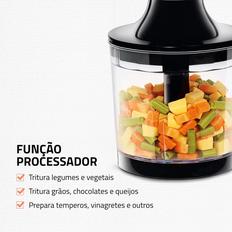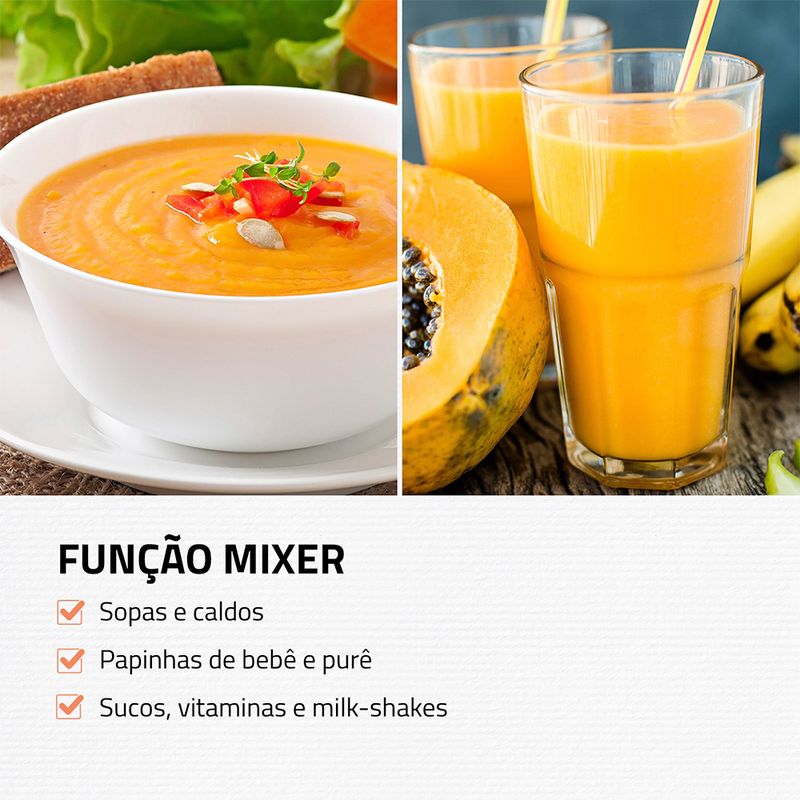 2 em 1: Eficiente e versátil, o aparelho desempenha duas funções, a de mixer e a de processador de alimentos. Permite preparar sopas e caldos, sucos e vitaminas, triturar legumes e vegetais, grãos e temperos.