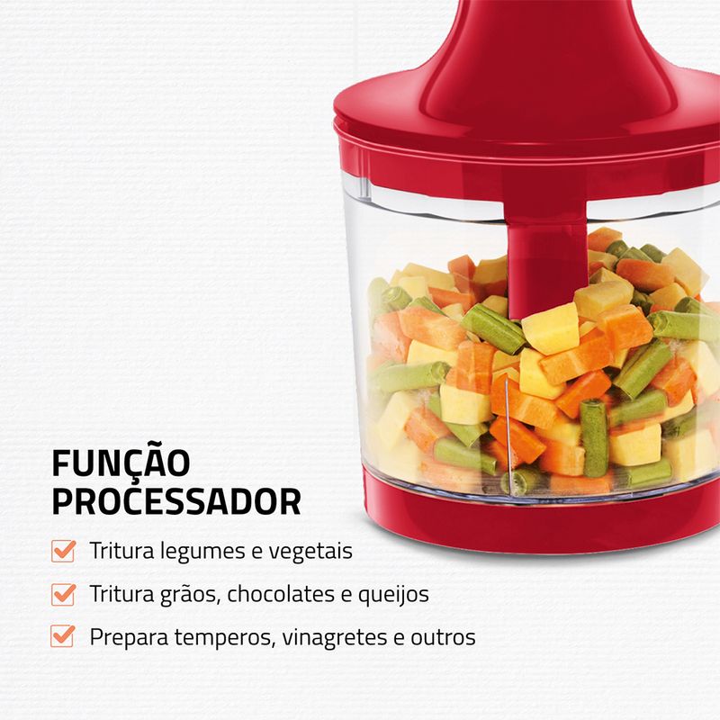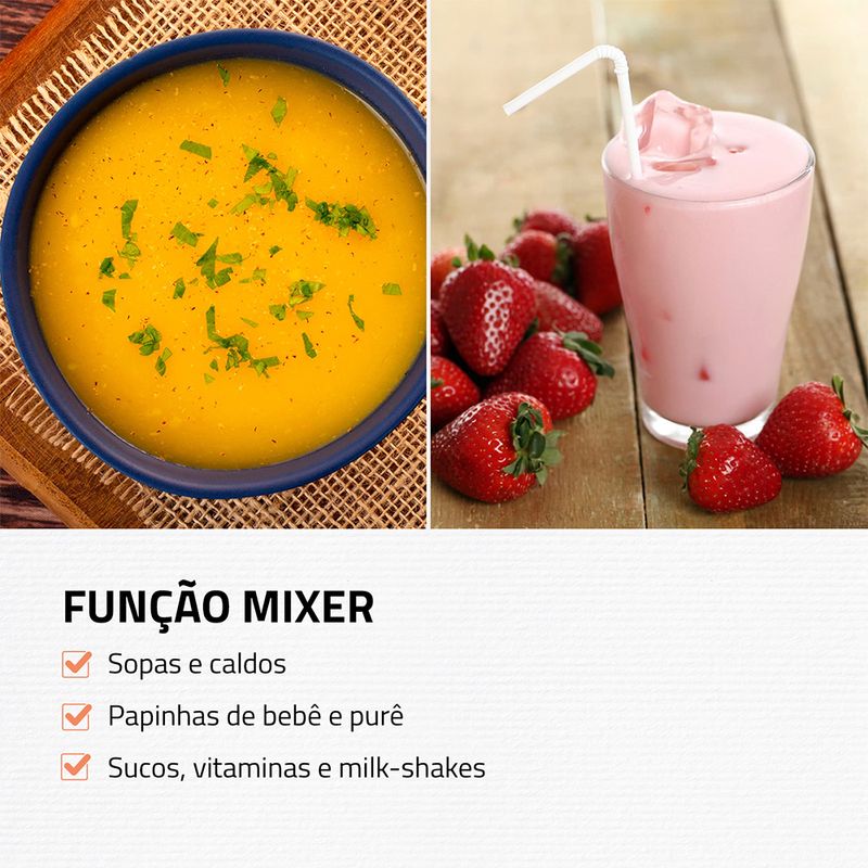 2 em 1: Eficiente e versátil, o aparelho desempenha duas funções, a de mixer e a de processador de alimentos. Permite preparar sopas e caldos, sucos e vitaminas, triturar legumes e vegetais, grãos e temperos.