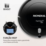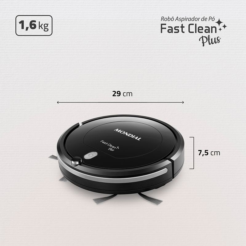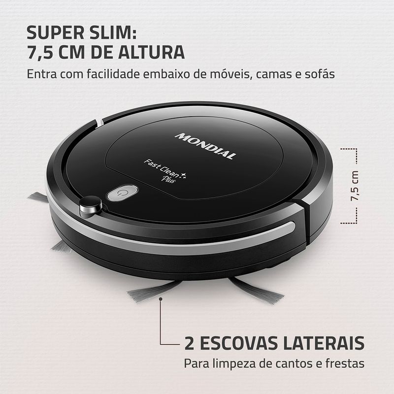 O Robô Aspirador de Pó Fast Clean Plus RB-03 ajuda manter sua casa limpa enquanto você faz outras coisas! Versátil, ele varre, aspira e passa pano com apenas um toque. Possui controle remoto com 3 funções de limpeza pré-programadas, função MOP e escovas laterais para a limpeza dos cantos. Ele aspira a casa inteira sozinho e tem um sensor que, além de detectar a sujeira, faz o robô desviar de obstáculos e não cair. Saiba mais sobre o RB-03 da Mondial: