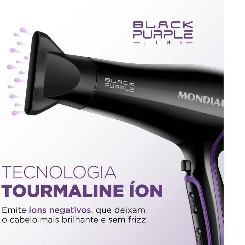 Cabelo seco de forma super-rápida: check! Os 2.000W de potência do Black Purple SCN-01 garantem um excelente desempenho para secagem ágil e eficiente. Além disso, a tecnologia Tourmaline Íon proporciona um aspecto mais saudável aos fios, reduzindo o frizz. Saiba mais sobre o Secador de cabelo Mondial: