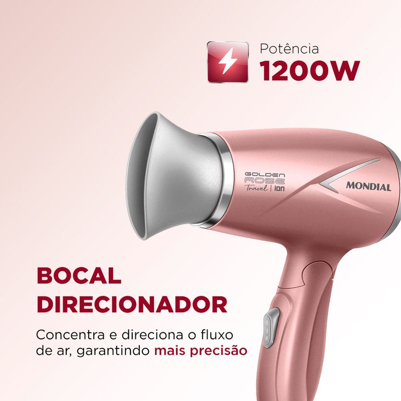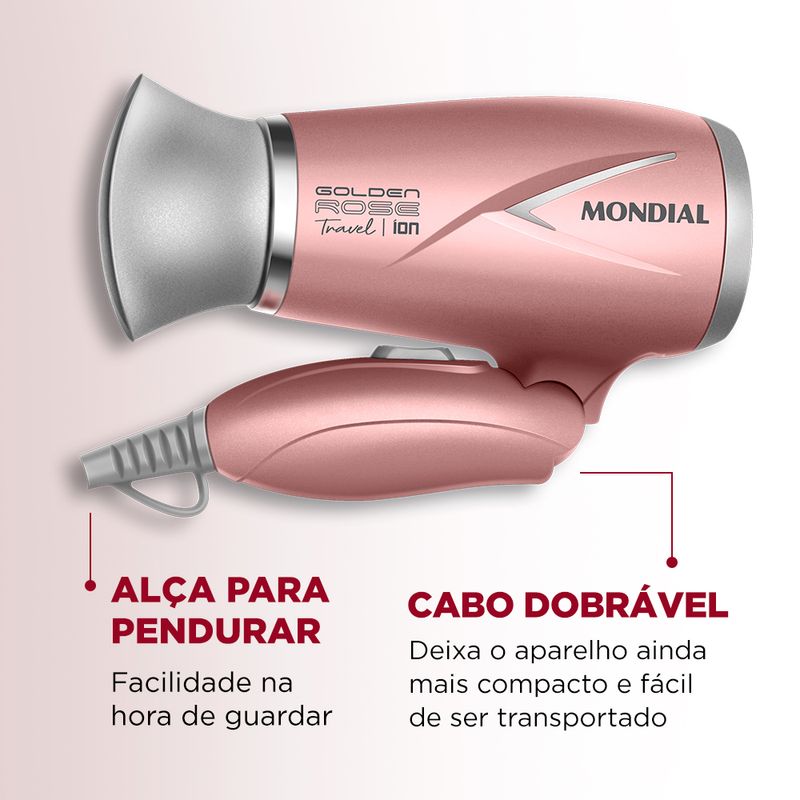 PORTÁTIL: CABO DOBRÁVEL: O Golden Rose tem design leve e compacto, além de cabo dobrável. Você dobra e encaixa seu aparelho na bolsa ou na mala com facilidade. Incrível, né? Leve seu secador para qualquer lugar!