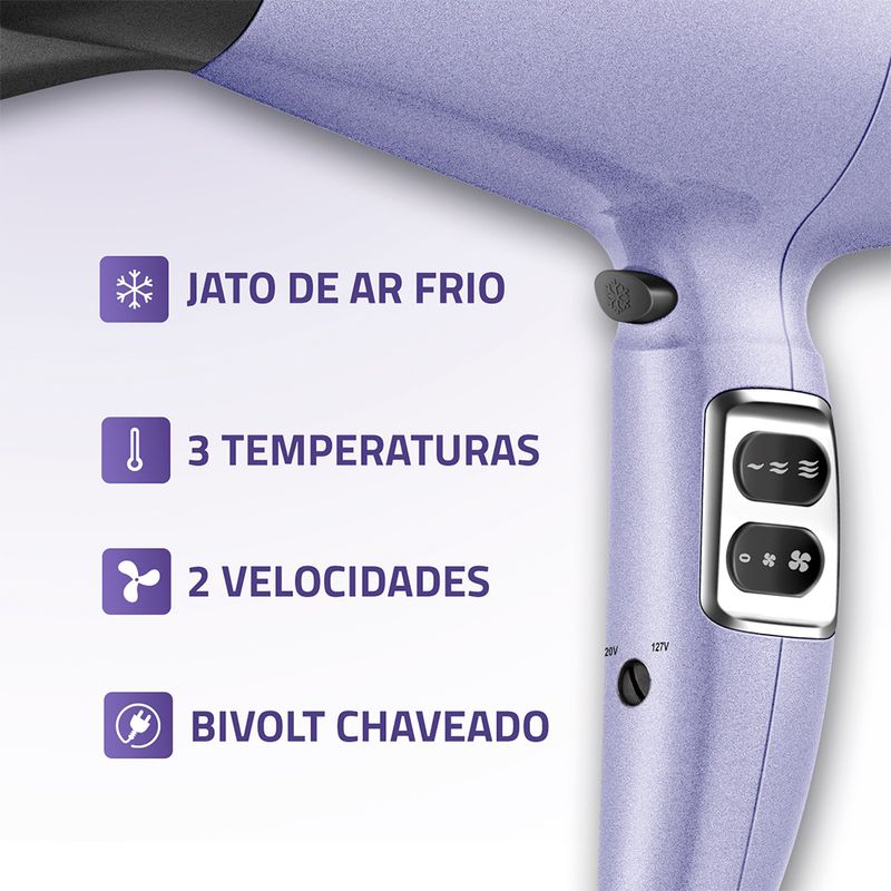 Bivolt Chaveado: Pode ser utilizado nas voltagens 127V e 220V. Basta ajustar a chave seletora e ter a liberdade para usar seu secador em qualquer lugar.