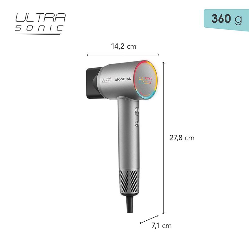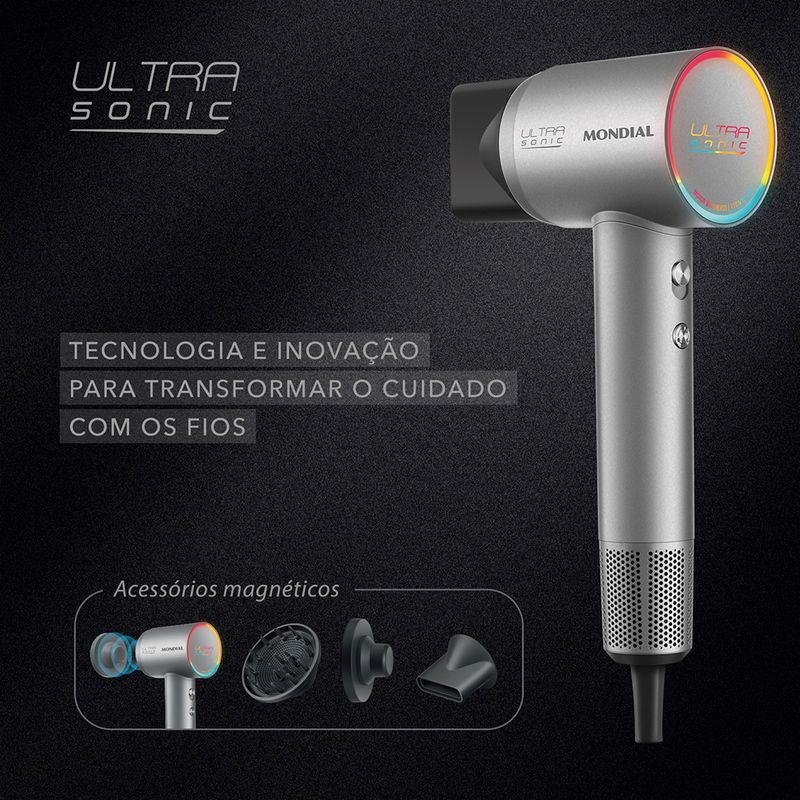 Novo Design: Leve e sofisticado, o secador Ultra Sonic oferece conforto no uso prolongado. Os acessórios magnéticos, incluindo o suporte de parede, facilitam o armazenamento e o manuseio no dia a dia.