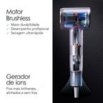 Vem com bocal concentrador, difusor e suporte de parede, todos com encaixe magnético para mais praticidade, segurança e agilidade no uso. O motor Brushless com 110.000 rpm oferece fluxo de ar intenso e seca mais rápido, com menos calor nos fios.