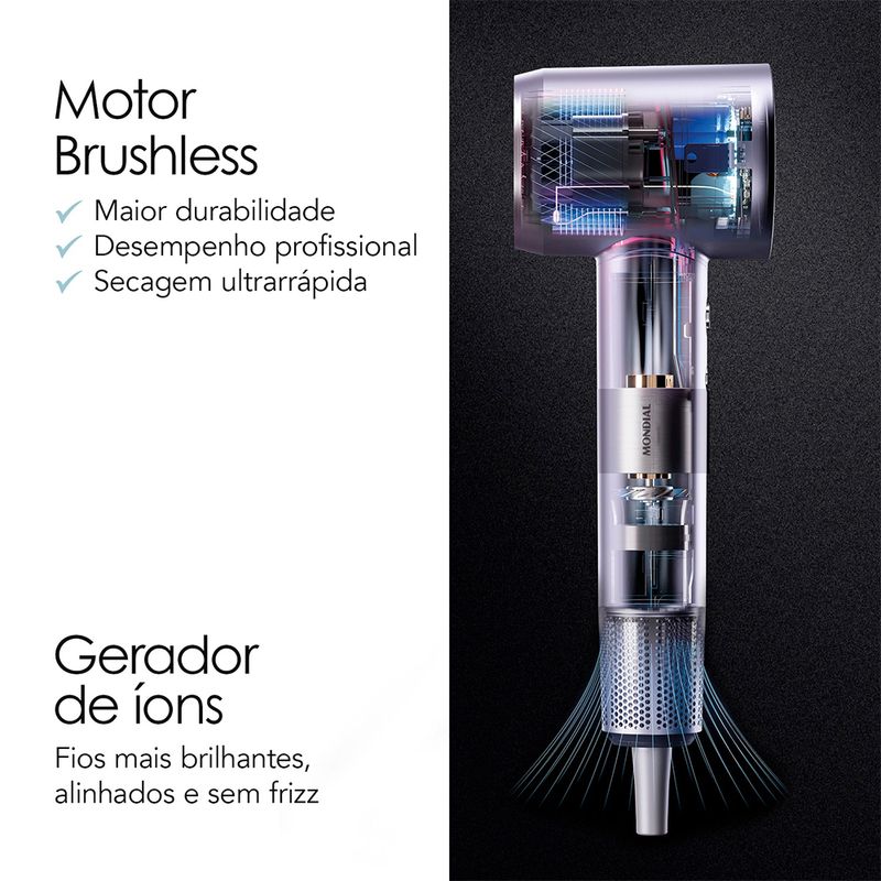 Motor Brushless: Tecnologia de nova geração com performance superior. Fluxo de ar potente, maior durabilidade e o dobro da velocidade para uma secagem rápida e desempenho profissional.