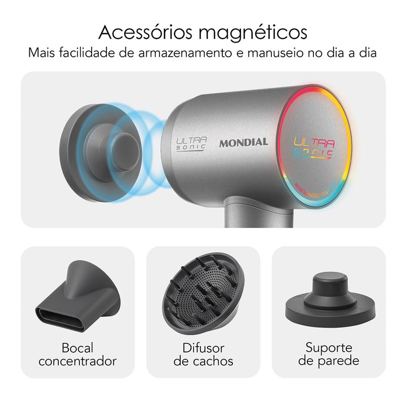 Acessórios Magnéticos: Inclui bocal concentrador, difusor de cachos e suporte de parede. Fáceis de encaixar e com excelente fixação, não soltam durante o uso.
