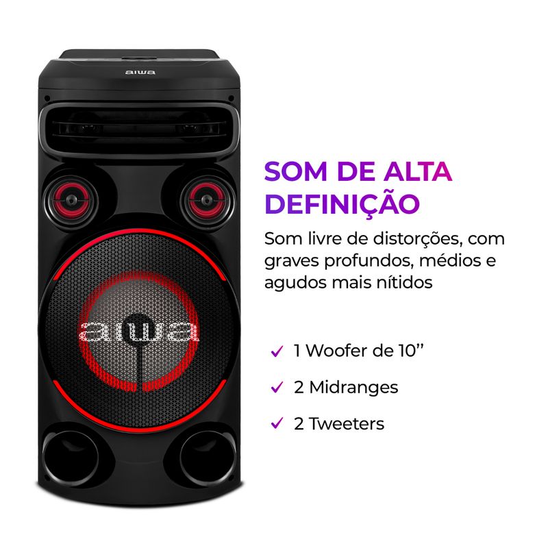 Toda festa animada precisa de um som poderoso. Com a torre de som Aiwa AWS-T1W-01 você vai ter uma experiência sonora que vai aquecer qualquer pista. São 1500W de RMS potência garantem um som de alta definição com graves mais profundos e agudos mais nítidos!