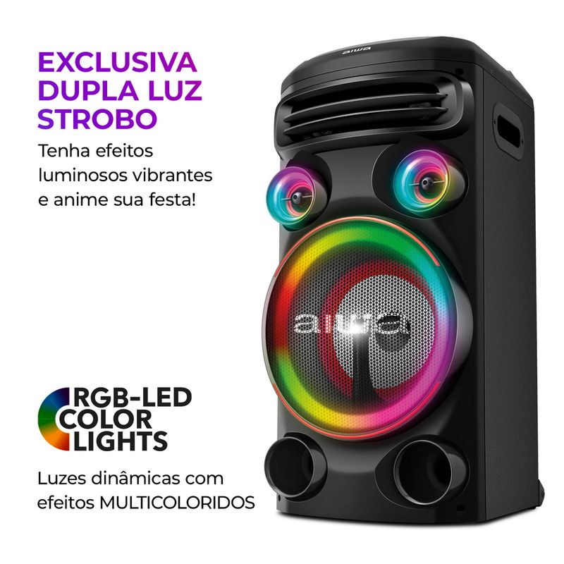 Som, luz, ação! A Torre de Som Aiwa AWS-T1W-01 possui 1500W RMS de potência e o som poderoso é garantia de um som de alta definição com graves mais profundos, que vão aquecer qualquer pista! Além disso, as funções Exclusiva Dupla Luz Strobo e o RGB Led Color Lights conferem um cenário de luzes multicoloridas e efeitos luminosos vibrantes que não vão deixar ninguém parado. Saiba mais sobre a Torre de Som Aiwa AWS-T1W-01: