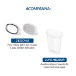 Acessórios: Acompanha duas escovas para tecidos delicados e remoção de pelos, e um copo medidor para facilitar o abastecimento de água.