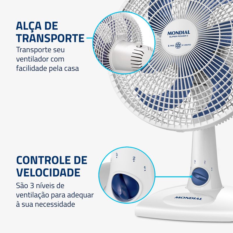 O ventilador Mondial Super Power II tem 30 cm de diâmetro e hélice com 6 pás, que proporcionam um fluxo de ar intenso para criar um ambiente mais agradável. O sistema de oscilação horizontal amplia o alcance da ventilação, enquanto o botão de trava permite manter o ar direcionado. Com inclinação vertical ajustável, o aparelho direciona o vento com precisão - para cima ou para baixo - oferecendo mais conforto no uso diário.
