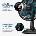 Alça de Transporte: Além do design compacto, a alça traseira permite que o ventilador seja transportado entre os cômodos da casa com facilidade.