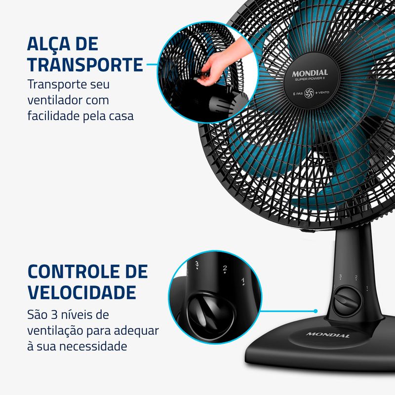 Vento Super Power: Design com 30cm de diâmetro e 6 Pás. Promove maior intensidade do vento e um ambiente fresco e agradável.
