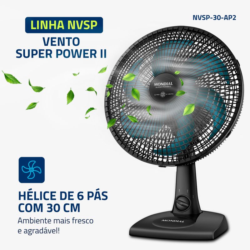 Vento Super Power: Design com 30cm de diâmetro e 6 Pás. Promove maior intensidade do vento e um ambiente fresco e agradável.
