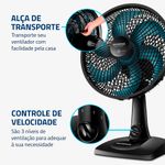 ALÇA DE TRANSPORTE + PORTA-FIO: Além do design compacto, a alça traseira permite que o ventilador seja transportado entre os cômodos da casa com facilidade. Com o porta-fio embutido, você armazena o fio elétrico dentro do aparelho após o uso.